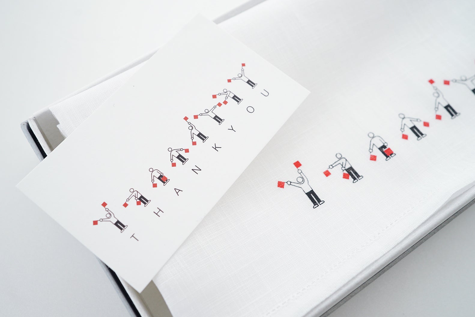 手旗信号で「THANK YOU」を表現した一枚。綿のなじむ柔らかさと麻のシャリ感の特徴が合わさった気持ちの良い素材感です。専用の「THANK YOU」と書かれたカード付きです。