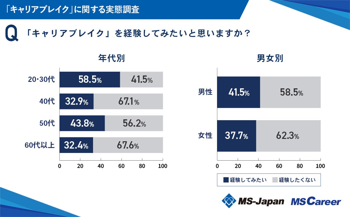 男女別では、男性は41.5%、女性は37.7%が「キャリアブレイクを経験してみたい」と回答していました。