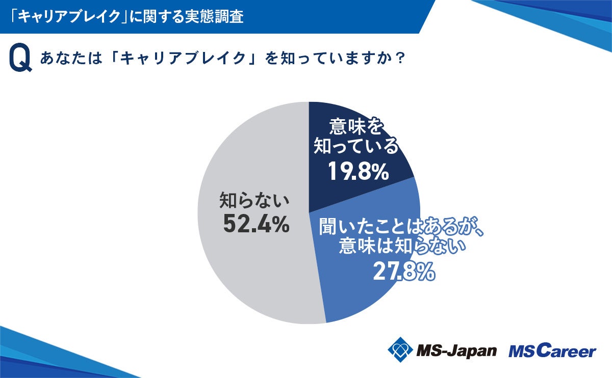 「意味を知っている」は19.8%、「聞いたことがあるが、意味は知らない」が27.8%と、半数近くの人がキャリアブレイクを知っていることが分かりました。