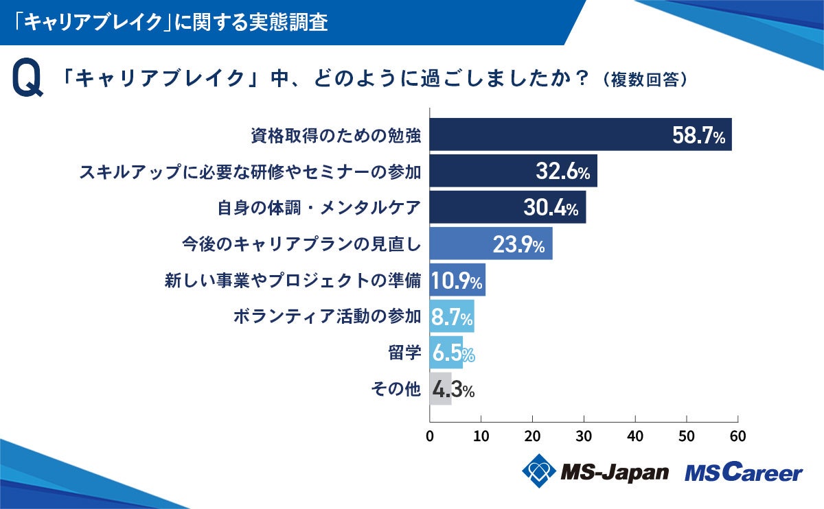 また、キャリアブレイク中の過ごし方を聞いたところ、「資格取得のための勉強」をしている人が58.7%と6割近くを占めていました。