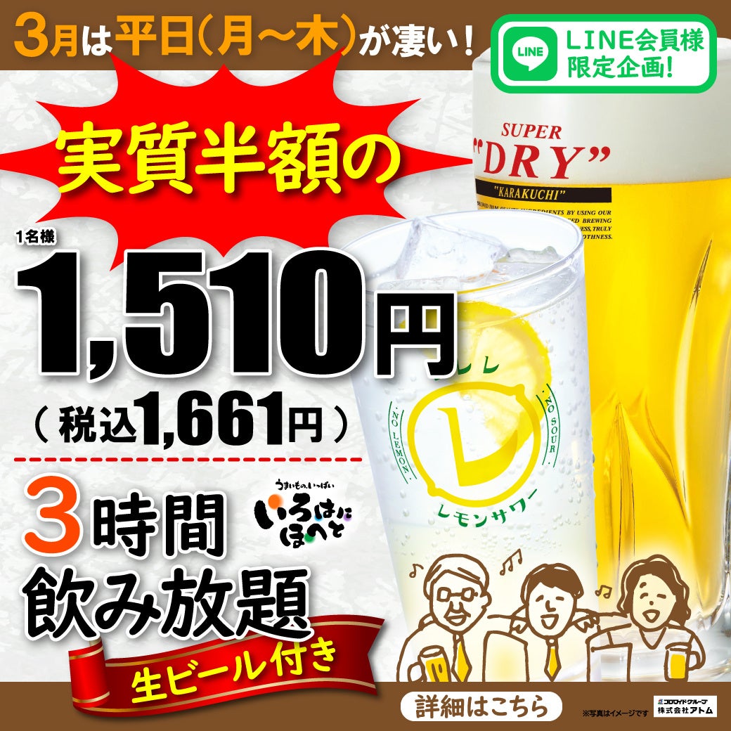 【 実質半額!3時間飲み放題 1,510円(税込1,661円)概要】