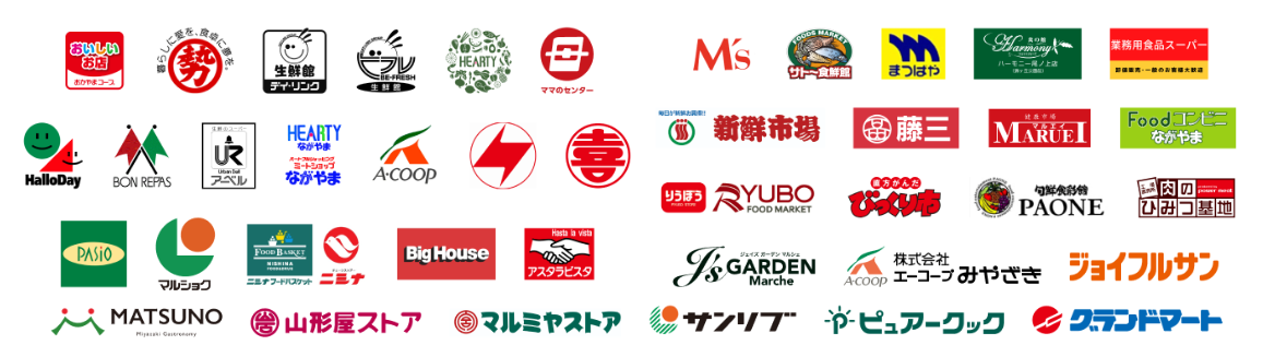 まるき、ハローデイ、ボンラパス、デイリンク、アーベル、ビフレ、まつばや、ピュアークック、りうぼう、健康市場マルエイ、ハーモニー、マルショク、サンリブ、ジョイフルサン、ママのセンター、ジェイズガーデン、グランドマート、エーコープみやざき、マルミヤストア、新鮮市場、Foodコンビニながやま、HEARTYながやま、ミートショップながやま、エーコープ鹿児島、サトー食鮮館、おかやまコープ、旬鮮食彩館PAONE、パシオ、ショッピングマルセイ、山形屋ストア、びっくり市、まつの、藤三、ビッグハウス、ニシナ、ニシナ フードバスケット、肉のひみつ基地、ライフセンターヤクデン、エムズ、業務用食品スーパー、アスタラビスタ