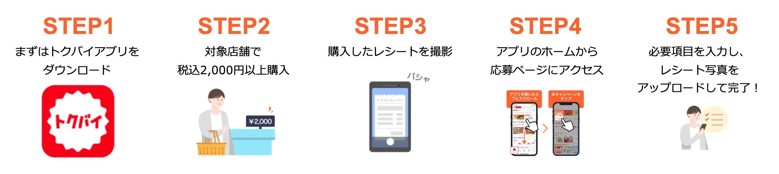 期間内に対象店舗で税込2,000円以上購入したレシートを使って、「トクバイ」アプリから応募。