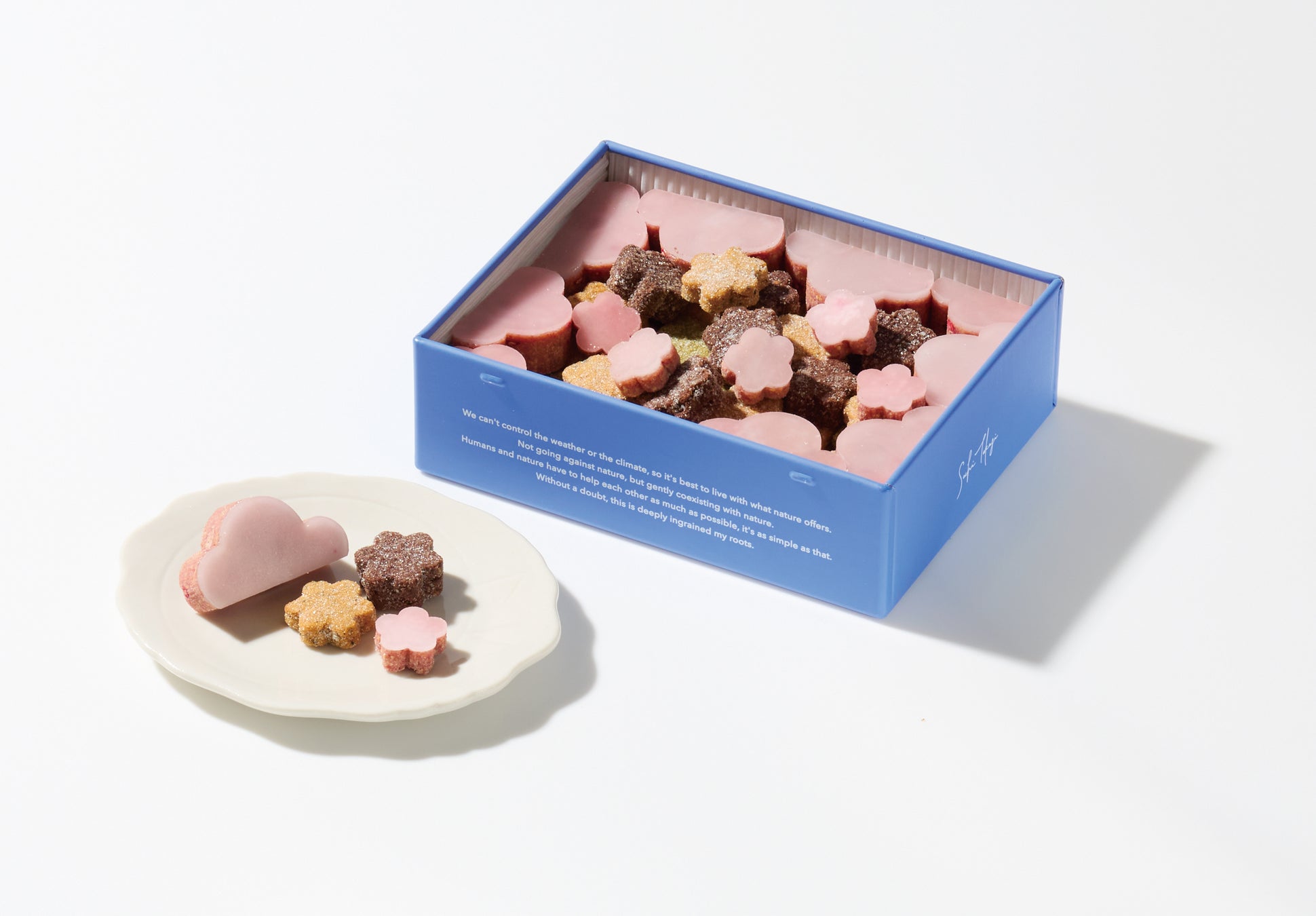 まるでお花畑のように6種の花型クッキーを散りばめた缶。学生の案から発想を得た早春を象徴する梅の花をモチーフにしたイチゴ味のクッキーは春の訪れを表現。全て植物性素材を使用。