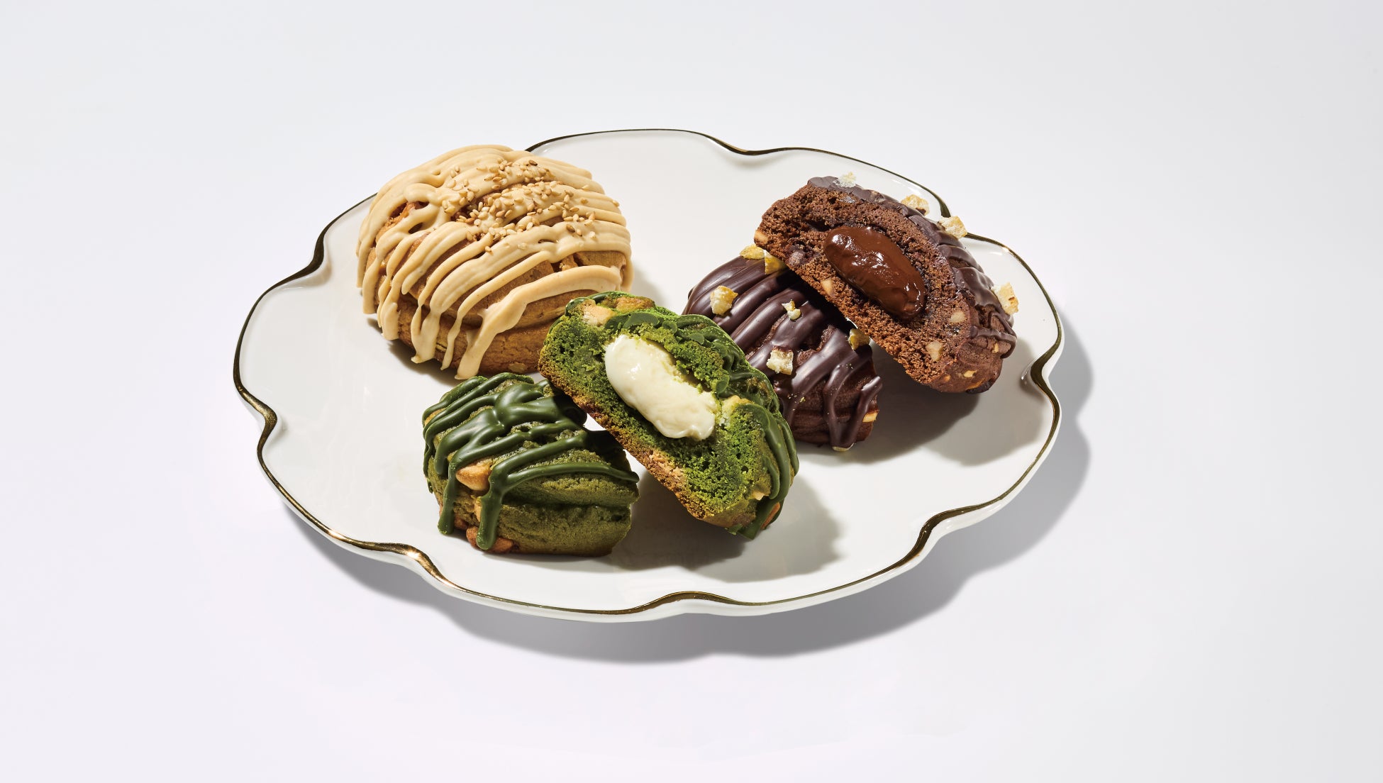 温めると中からとろっとガナッシュがあふれ出すオリジナルスコーン。募集した案で一番多かった抹茶×ホワイトチョコにチョコ×柚子、そしてシェフの出来栄えNo.1のきな粉×胡麻の3種がセットに。シェフイチオシのフレーバーきな粉、胡麻(本多さん案採用)
