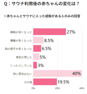 サウナ利用後の赤ちゃんの変化としては、半数が「特に変化はない」とのことだったものの、「睡眠が深くなった」「機嫌が良くなった」等の良い変化をした赤ちゃんが58.45%もいることがわかりました。