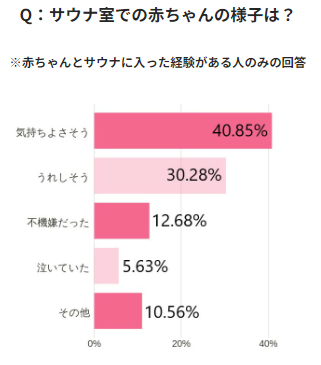 サウナ室での乳児の様子としては、「気持ちよさそう」がトップの40.85%で、続いて「うれしそう」が30.28%という結果に。赤ちゃんにサウナってどうなの? 熱くて泣いてしまうのでは?というイメージを持つかたも多い一方、意外にも71%の赤ちゃんは好反応を示したようです。反対に不機嫌だった・泣いていたといったマイナスの反応を示したのは、約18%と、好反応の赤ちゃんよりも低い割合となりました。