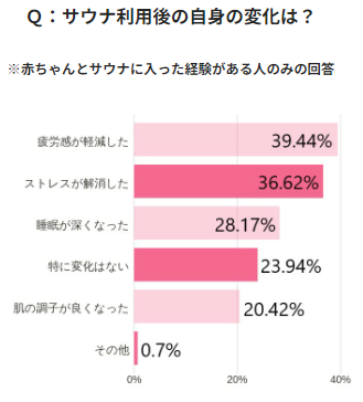 赤ちゃんとサウナの実態調査【Part2】の調査報告では、赤ちゃんとのサウナの入り方についてみなさんの意見を公開しました。【Part3】ではそのサウナで実際に得られた効果にはどのようなものがあったのか、ご紹介していきます。