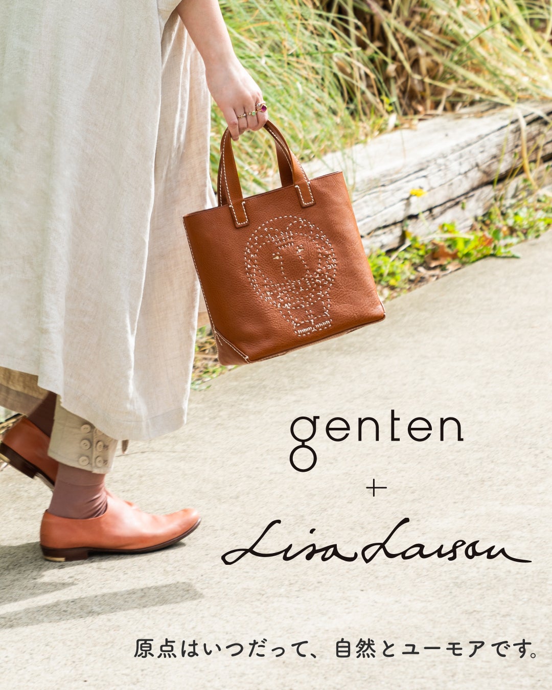 「人間も自然の一部である」という原点に立ち、鞄づくりを通じて環境との共存を発信してきた「genten」。そして土という天然素材から作品を生み出し、強い作家性を内包しながらも、暮らしにすっと溶け込む優しさとユーモアを届けてきたのがリサです。genten×LISA LARSONは、両者に共通する「自然とユーモア」をテーマに、リサの代表作をモチーフにお互いの原点に「革」で挑むコラボレーションです。(特集ページより)