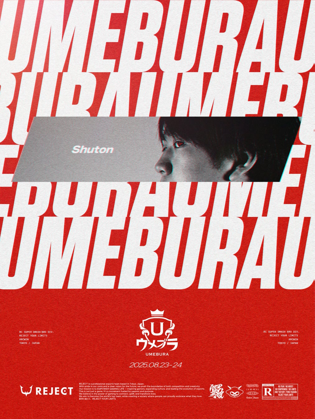 株式会社REJECT(本社:東京都港区、代表取締役:甲山翔也)が運営するプロeスポーツチーム「REJECT」は、大乱闘スマッシュブラザーズ部門所属のShuton(しゅーとん) が、2025年8月23日(土)〜24日(日)に東京都・浜松町で開催される国内最大級のスマブラ大会「ウメブラSP12」に出場することをお知らせいたします。