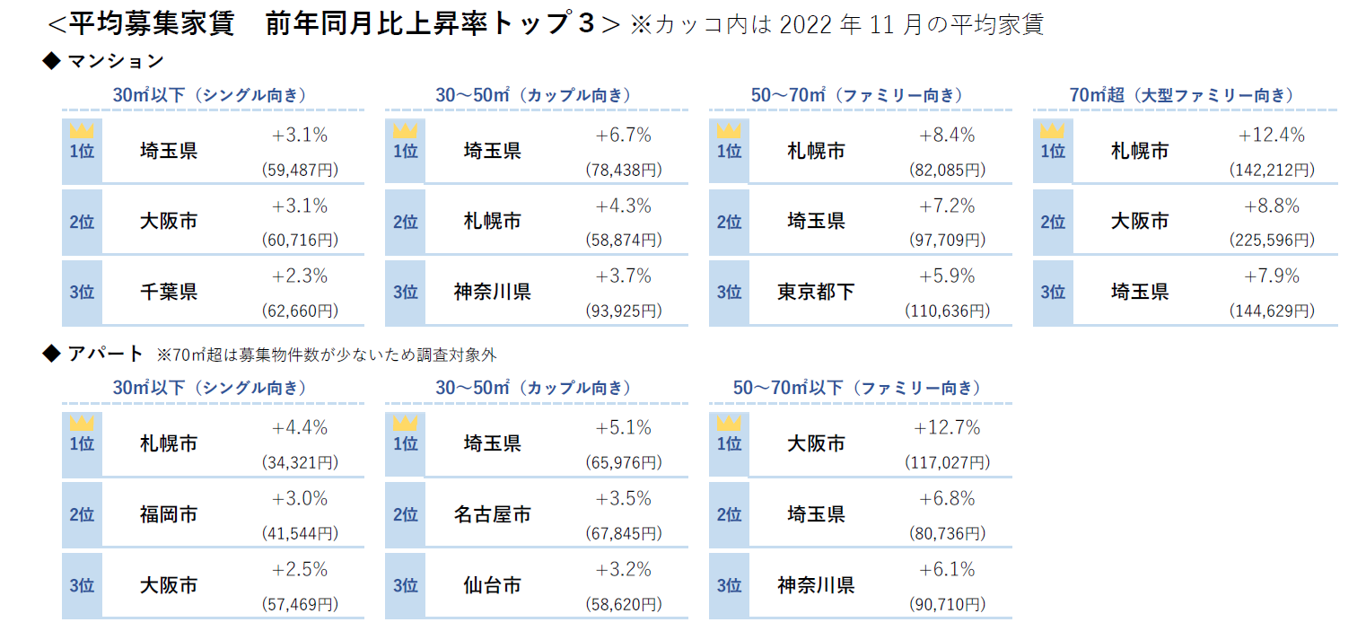 【アットホーム調査】全国主要都市の「賃貸マンション・アパート」募集家賃動向(2022年11月)