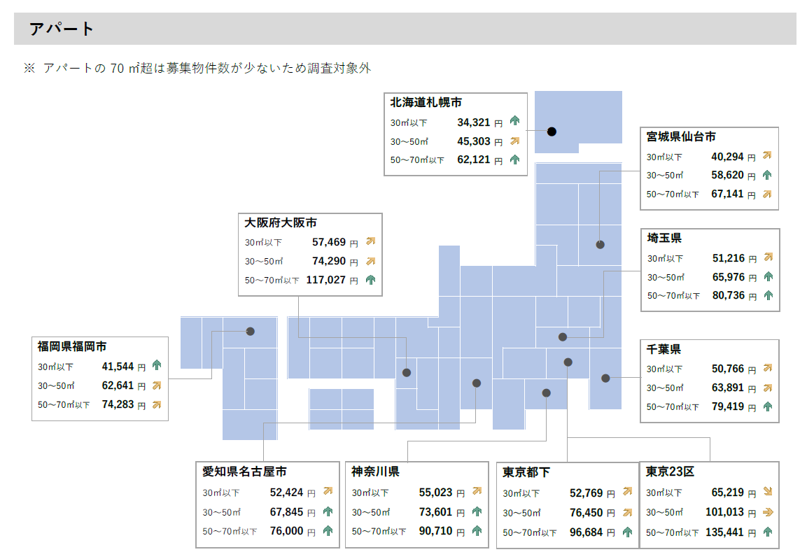 - マンションの平均募集家賃は、東京都下・埼玉県・千葉県・札幌市・名古屋市・大阪市の6エリアが全面積帯で前年同月を上回る。