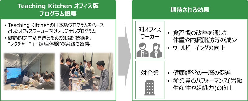 Teaching Kitchenは、肥満や糖尿病の治療を目的にハーバード大学の研究グループTeaching Kitchen Collaborativeが開発したものです。本プログラムは、そうした疾患を発症していないオフィスワーカーも予防的に取り組めるようアレンジしたもので、オフィスでの導入は国内初となります。
