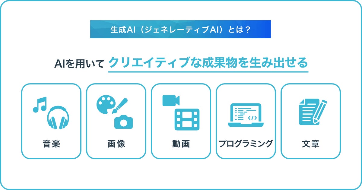 生成AIとは、「ジェネレーティブAI(Generative AI)」とも呼ばれるAI(人工知能)の一種です。AIを用いてクリエイティブな成果物を生み出すことができるのが特徴的で、生成できるものは楽曲や画像、動画、プログラムのコード、文章など多岐にわたります。