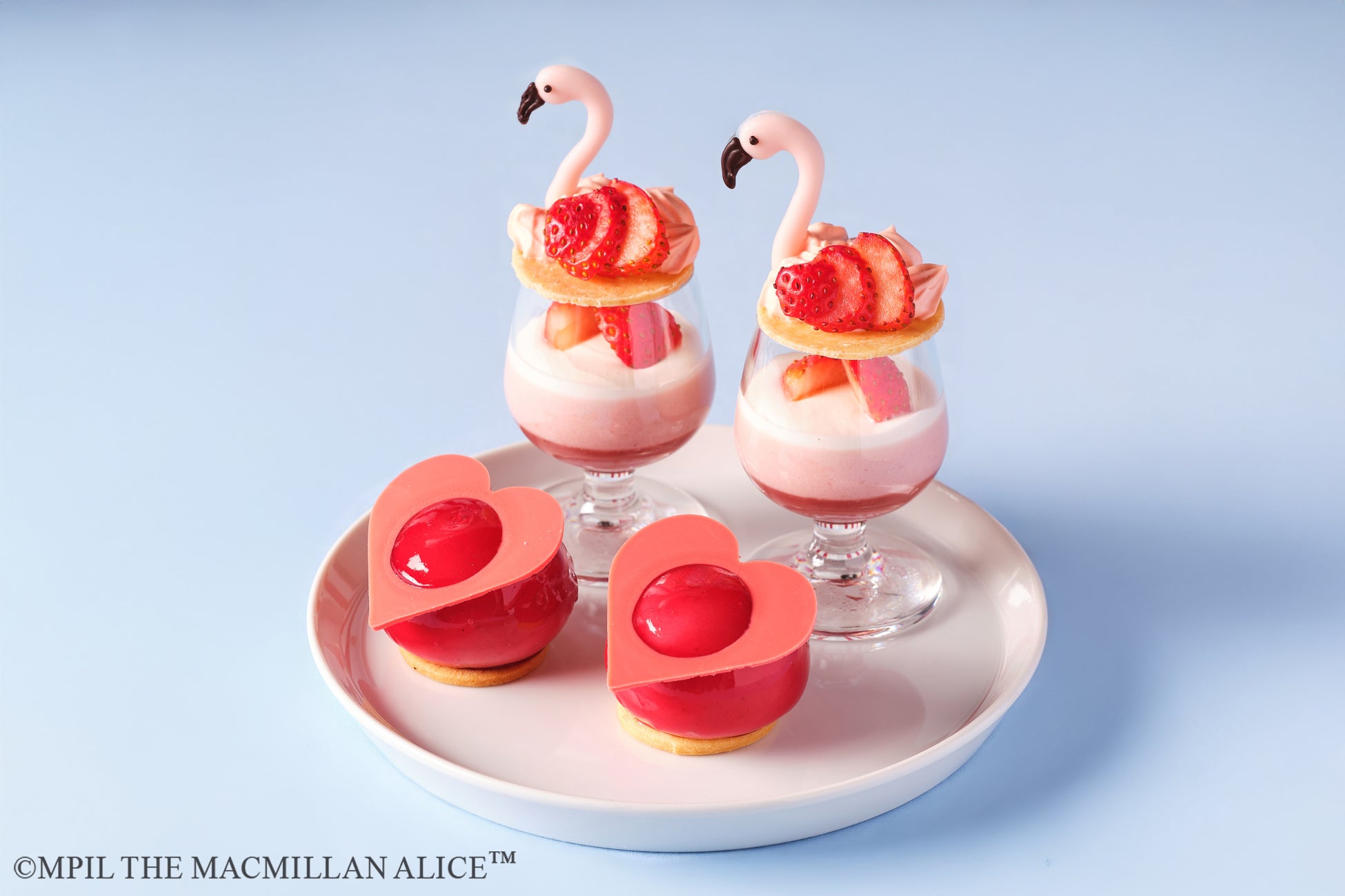 気まぐれで優雅な“フラミンゴ”を乗せたいちごといちご尽くしのヴェリーヌや、愛すべきいたずらっこ“三月ウサギ”を表現したシュークリーム、帽子屋の大きなシルクハットイメージのショコラケーク、ハートの女王の判決のように鋭く尖ったハート型のショコラを飾り付けた真紅のいちごムース、物語の主人公「不思議の国のアリス」のブルーのドレスを生クリームで表現したカップケーキ、瑞々しい甘さが広がる真っ赤ないちごのタルトの6種のスイーツをご用意。