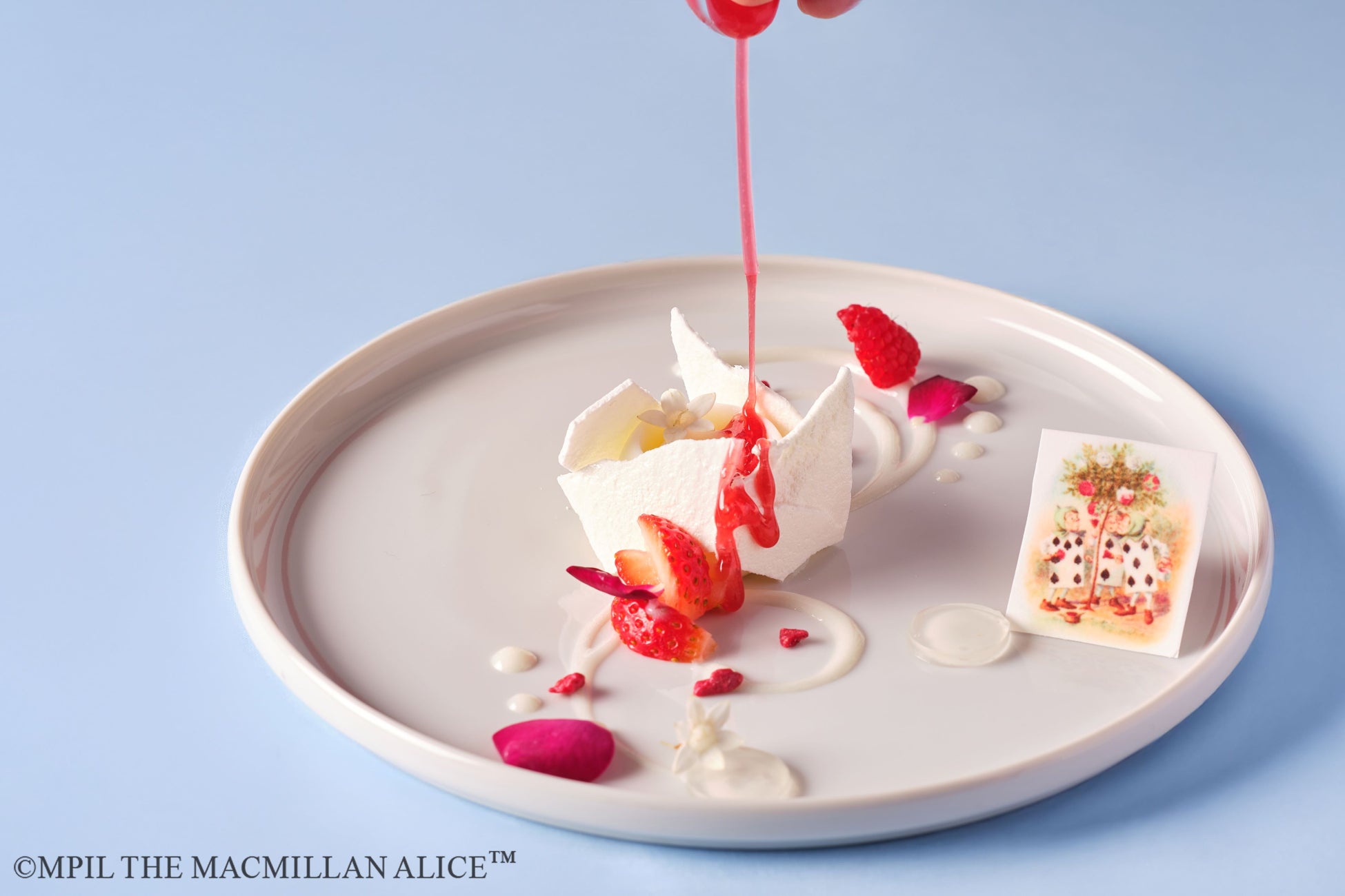 可憐な白い薔薇のムースを、ご自身で赤いラズベリーのソースやフレッシュいちご、ベリー、赤い薔薇で飾り付けて情熱的な赤い薔薇のお皿に変身させるスペシャルデザート「ペイント ザ ローズ」。トランプの園丁たちの作業になぞらえたマジックが目でも舌でも楽しめ、動画撮影も必至の一品です。