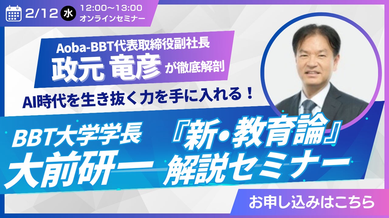 セミナーでは、ビジネス・ブレークスルー大学・大学院の学長である大前研一が提唱する「新・教育論」のポイントを、Aoba-BBT取締役副社長の政元竜彦がわかりやすく解説いたします。あわせて、期間限定で同講義動画を無料公開いたしますので、ぜひご視聴ください。