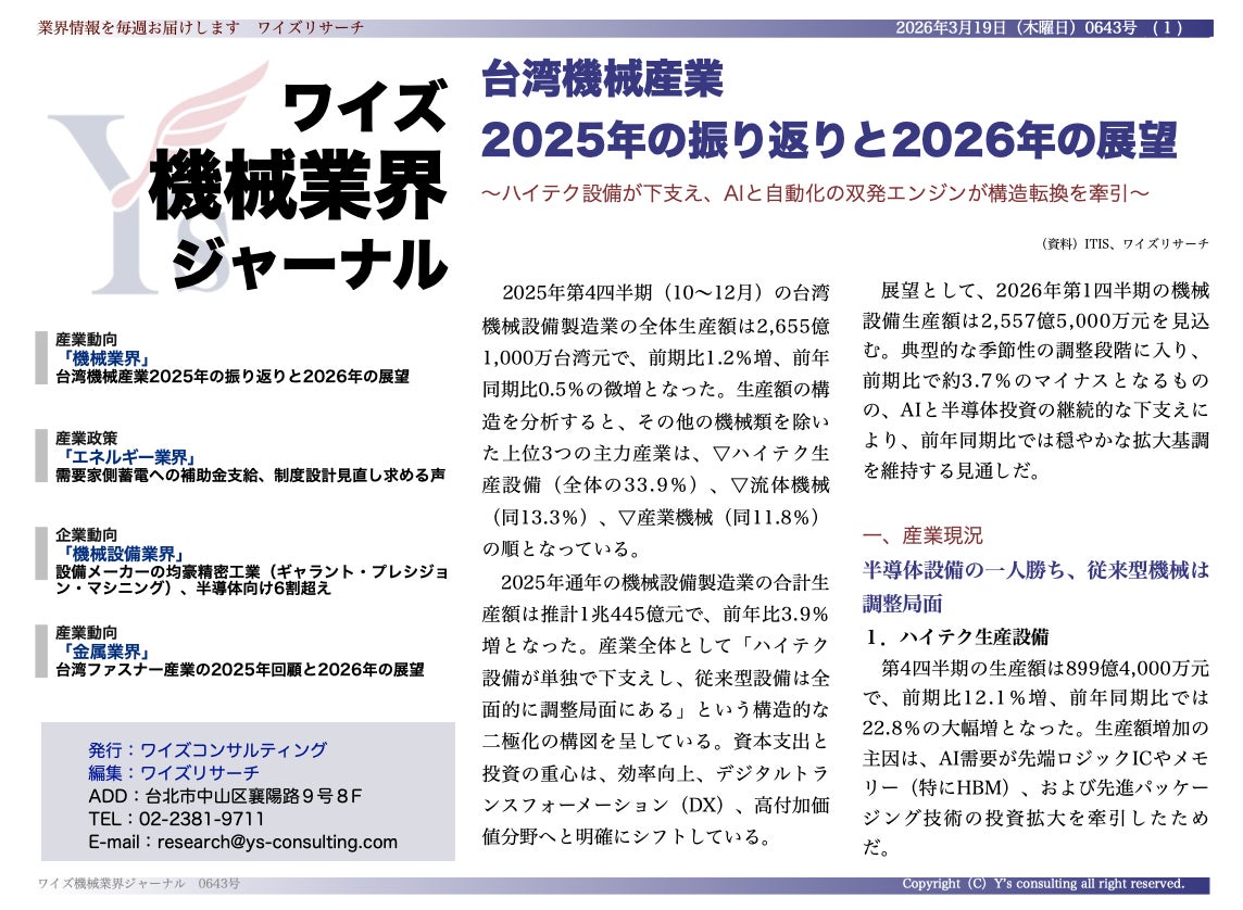 【台湾情報】【新刊ハイライト】台湾機械産業、2025年はハイテク設備が牽引──AIと自動化が構造転換を後押し<ワイズ機械業界ジャーナル2026年3月第3週号発行>