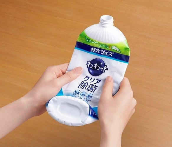 このたび、さらに環境への負荷を減らすため、「キュキュット」つめかえ用の特大サイズと超特大サイズは、新たなつめかえ容器「未来にecoペコボトル」として生まれ変わります。片手で持つことができてつめかえやすいボトルタイプの良さはそのままに、耐久性を保ちながら、ボトルの肉厚を極限まで薄くする挑戦を、花王の包装容器技術(特許出願中)で実現しました。容器のプラスチック使用量を約40%削減*1。