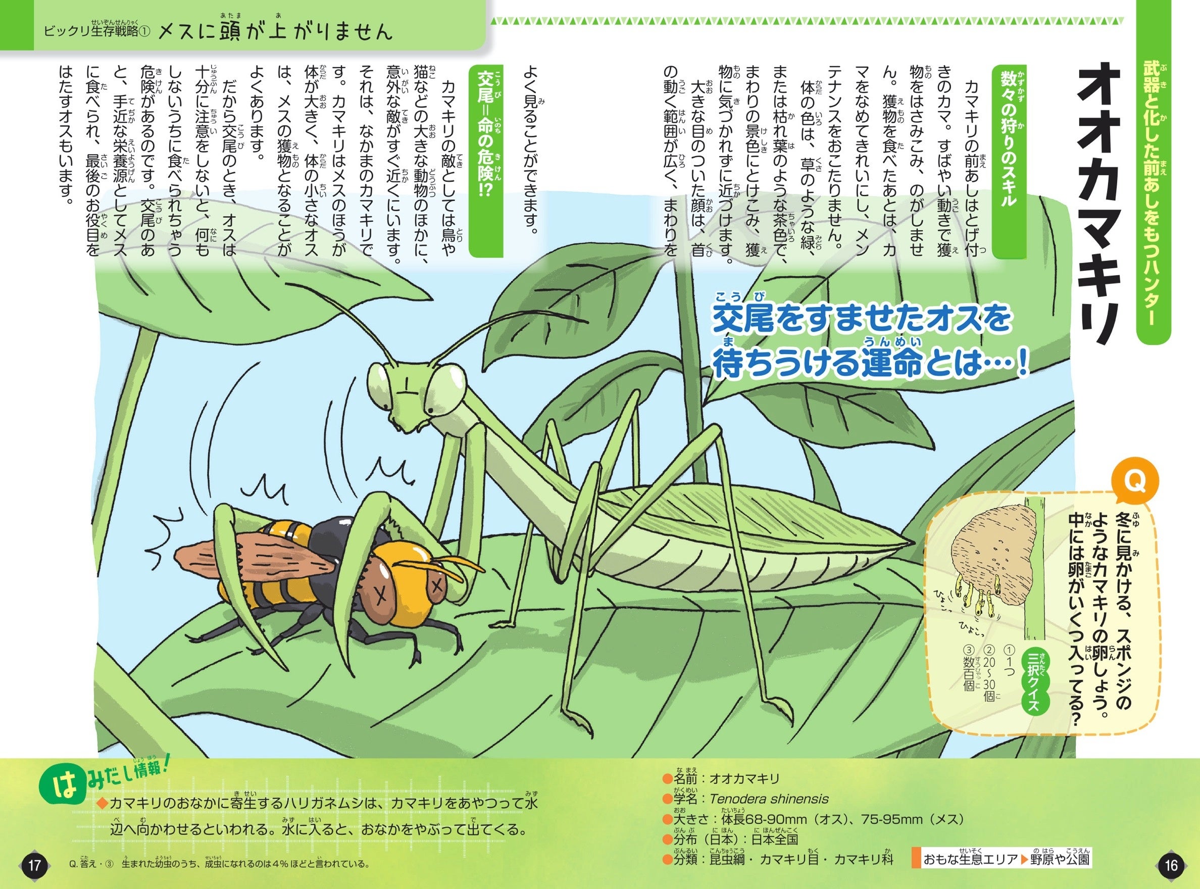 交尾が終わったらメスに食べられる、いかつい見た目なのに超ビビリ、ピンチの時は死んだふりをする――。そんな、涙ぐましい努力あり&ちょっと人間くさくて笑えちゃう、魅力たっぷりの昆虫の世界を、コミカルなイラストで表現しています。