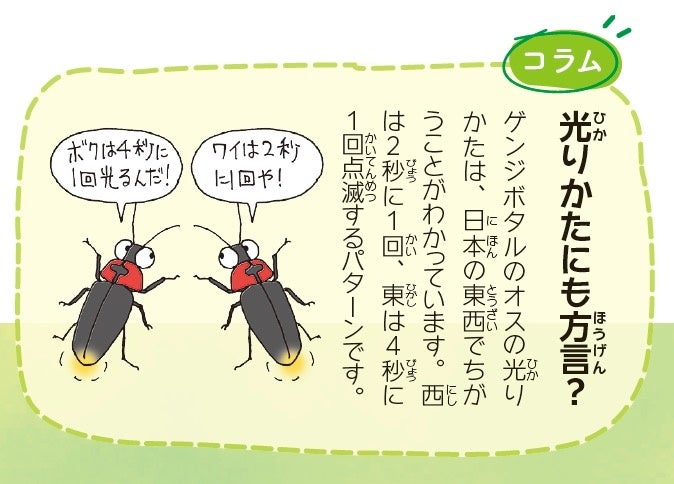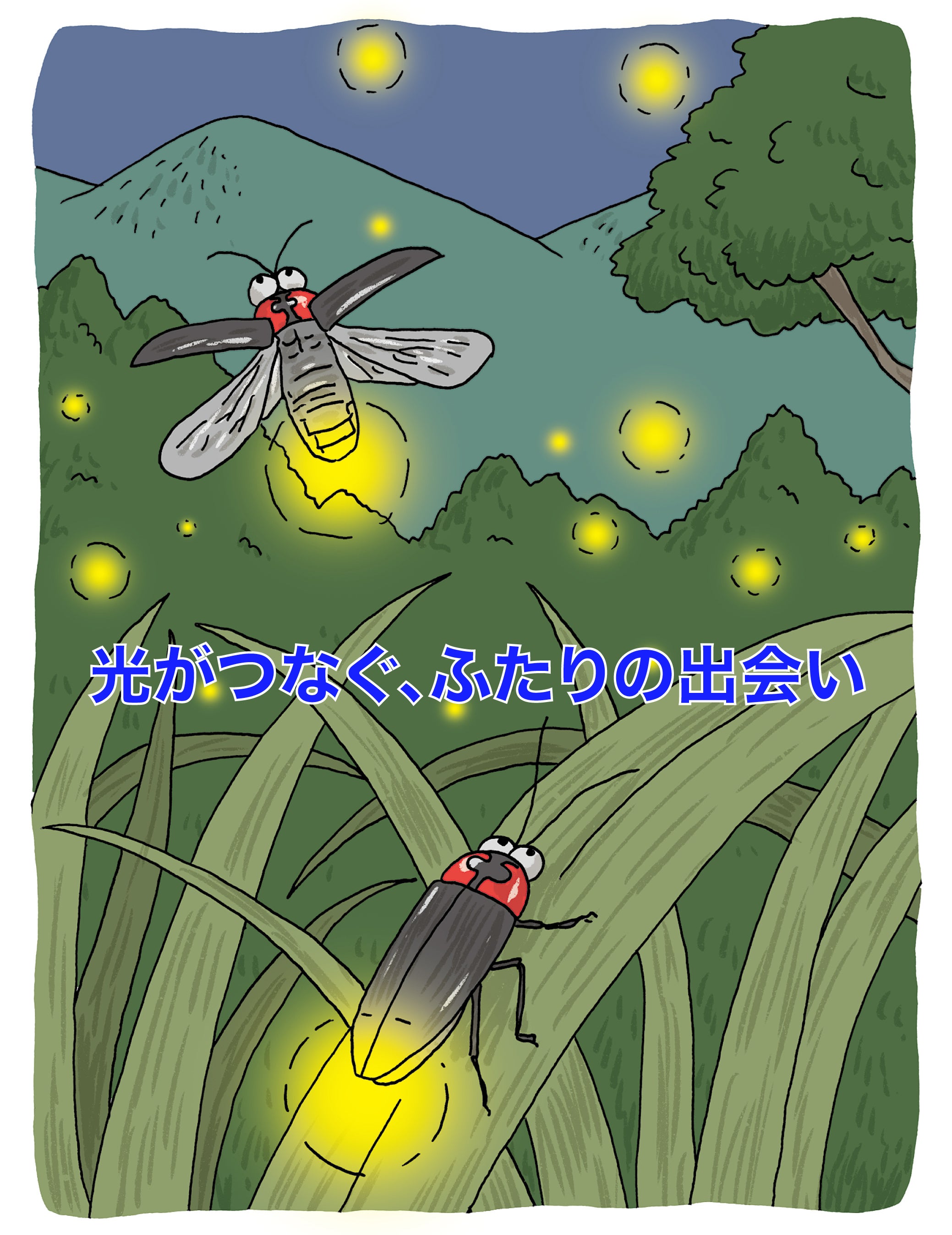 色、もよう、におい、音……昆虫は求愛のとき、さまざまな手段で相手をよびよせたり、気をひいたりします。夜に活動するホタルは、その手段に光を選びました。暗闇の中でも、光をたよりに、相手のいる場所へたどりつけます。