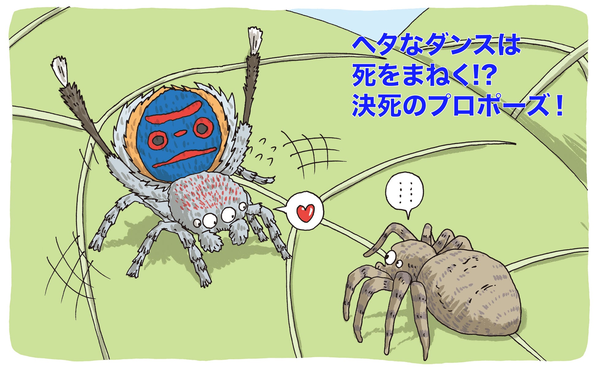 ピーコックスパイダーのオスは、メスを見つけると、あしをさかんに動かし、振動で相手の気をひくダンスをはじめます。そして、あしを上げて左右に動きながら、腹部背面にたたんであるきれいな膜を扇子のように広げ、これを立てて見せるのです。どこか催眠術のようなこのアピールが、無事に成功すると交尾できますが、失敗するとメスに食べられてしまうことも。