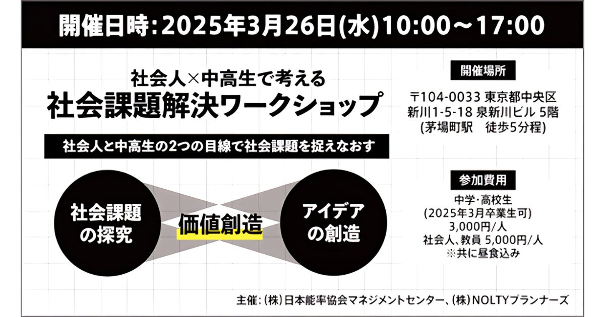 株式会社日本能率協会マネジメントセンター(代表取締役社長:張 士洛、東京都中央区、以下JMAM[ジェイマム])と株式会社NOLTYプランナーズ(代表取締役社長:細野 肇、東京都中央区、以下NOLTYプランナーズ)は、「社会人×中高生で考える 社会課題解決ワークショップ」を、2025年3月26日(水)に東京・茅場町で開催します。