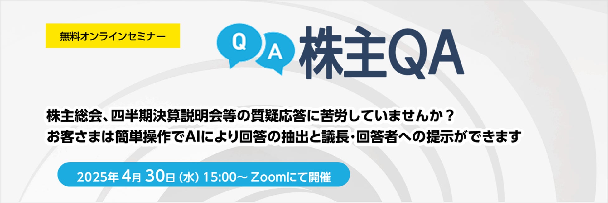 株式会社ニーズウェル(本社:東京都千代田区、代表取締役会長兼社長 船津浩三)は、2025年4月30日(水)15時より、無料オンラインセミナー「株主総会ソリューション「株主QA」無料セミナー ~株主総会、四半期決算説明会等の質疑応答に苦労していませんか?お客さまは簡単操作でAIにより回答の抽出と議長・回答者への提示ができます~」を開催します。