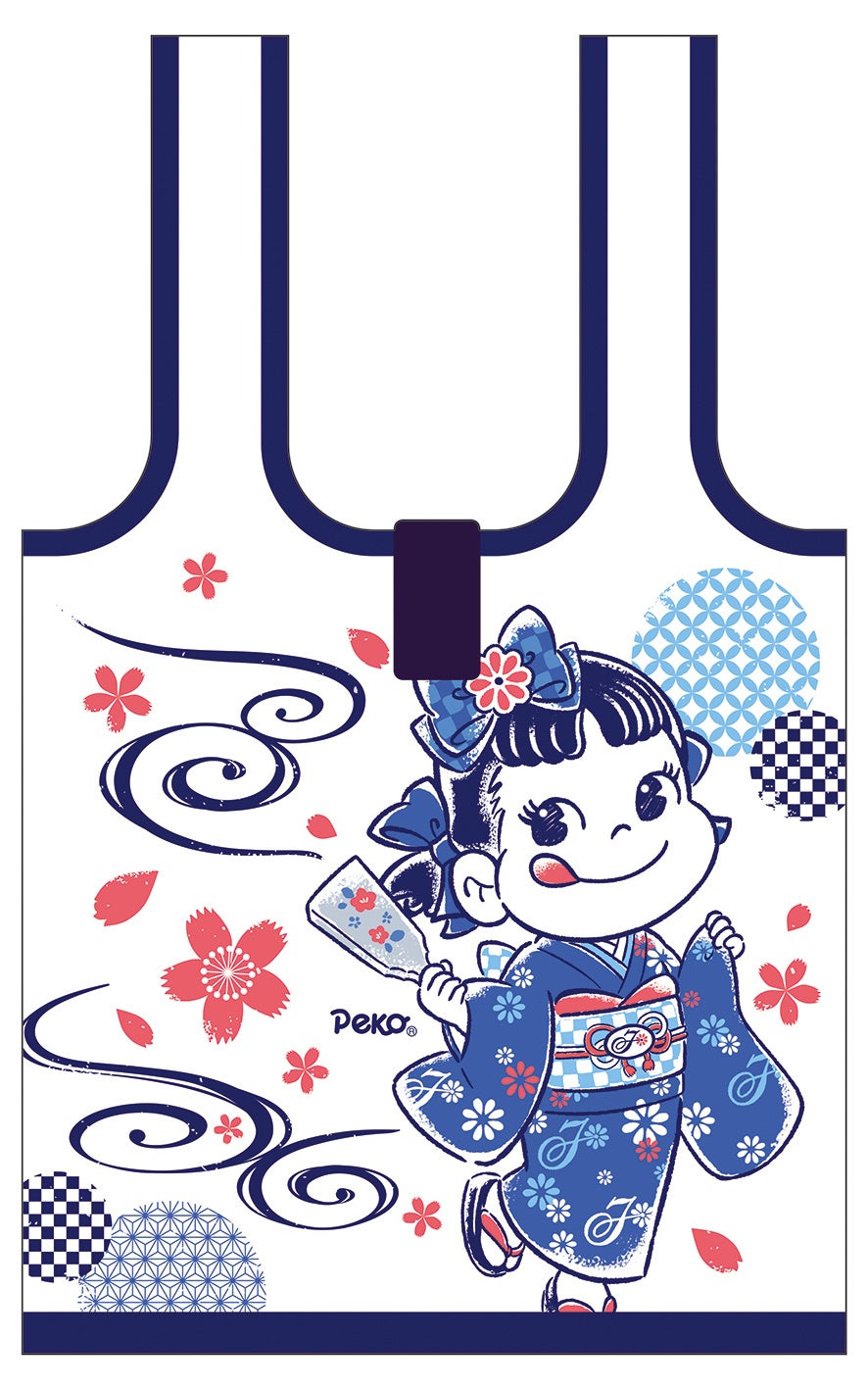 ちょっとしたお買物に便利なサイズで、日本らしい和柄や和風のペコちゃんをデザインしたエコバッグです。バッグをまとめられるゴムバンド付き。全5種ランダムで、どれが出るかはお楽しみ!