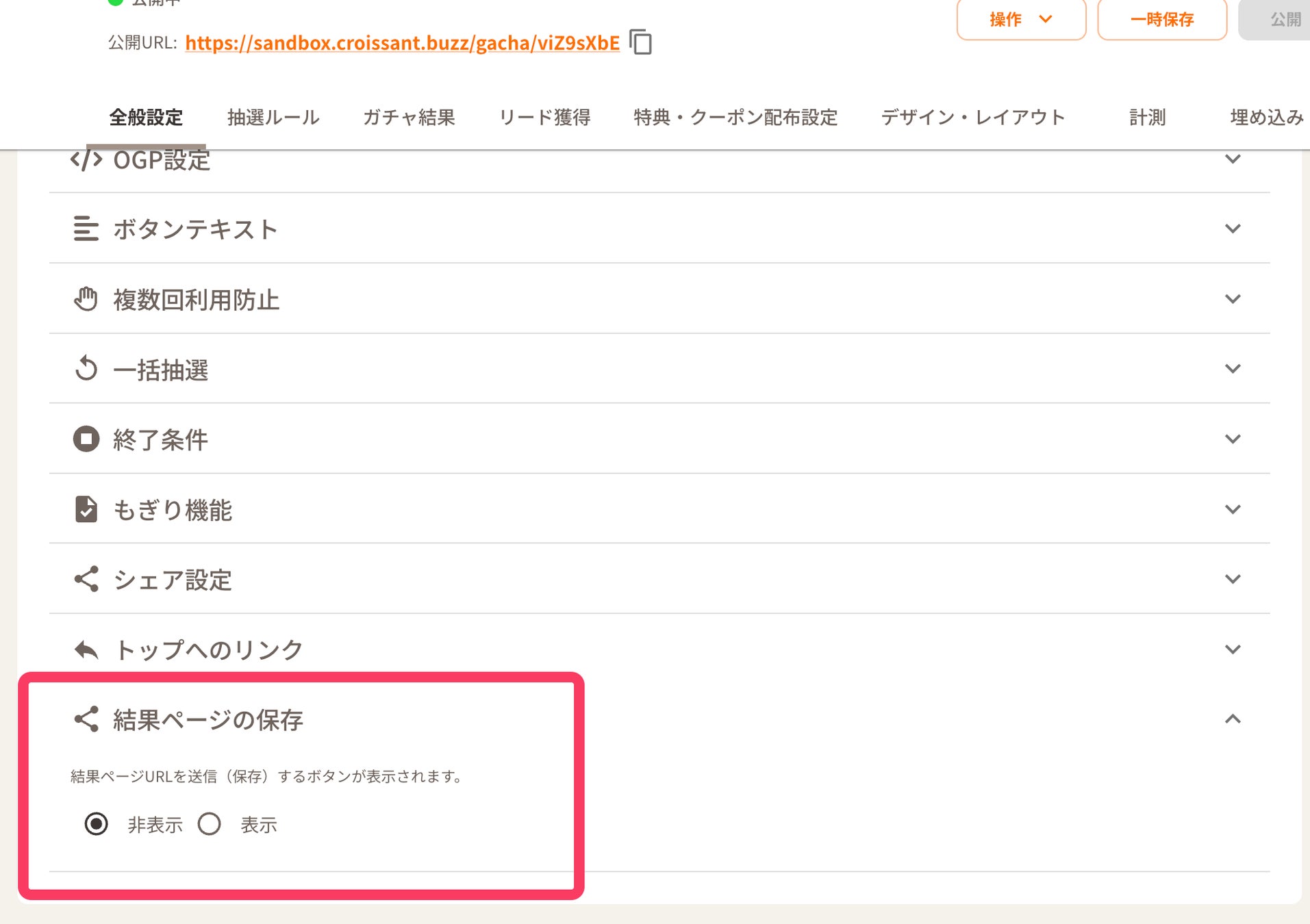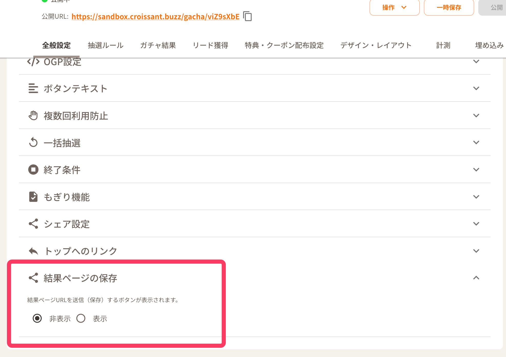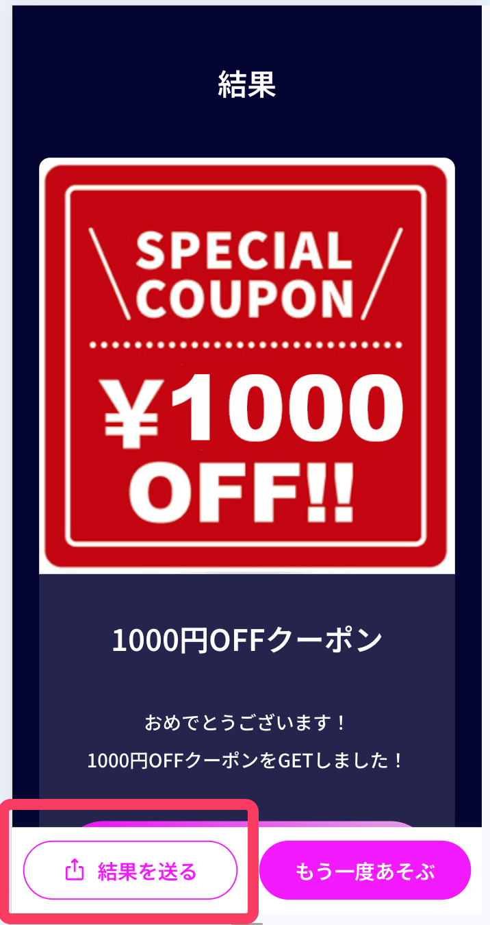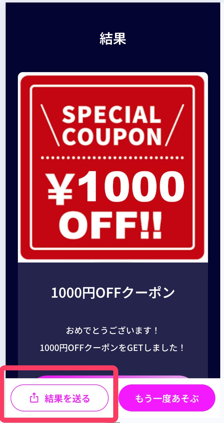 従来からのSNSシェアボタンに加え、ユーザーが結果ページのリンクを自分のLINEやメール、メモ等に保存できるようになることで、クーポンなどの「当たり結果」を、画面を閉じた後でも見失いにくくします。なお本機能は、管理画面からボタンの表示/非表示を設定できます。