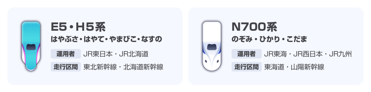 全国で運行されている新幹線を13種類のアイコンで表示しています。「のぞみ」や「はやぶさ」など、なじみがある列車もアイコンで表示しています。