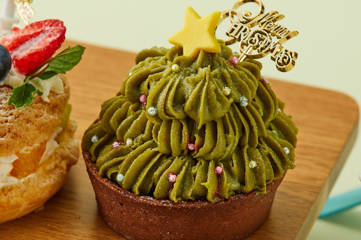 抹茶のマロンクリームをツリーに見立てて仕上げました。中にはチーズクリームと渋皮栗が丸ごと1粒入っています。