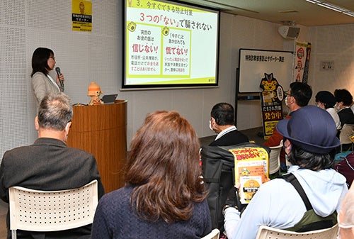 4月25日(木曜日)、初めて一般市民を対象とした講座が開催され市民77人が参加。「詐欺の手口を知って、被害を防ごう!」をテーマに講師を務める消費生活相談員から特殊詐欺の様々な手口、すぐに実践できる被害防止対策などを学びました。講座に参加して認定を受けた市民は「誰でも詐欺に騙される可能性があるので、不審に思った際にはすぐに消費生活センターへ相談したい」「講座で学んだことをまわりの人たちにも伝えていきたい」などと話していました。