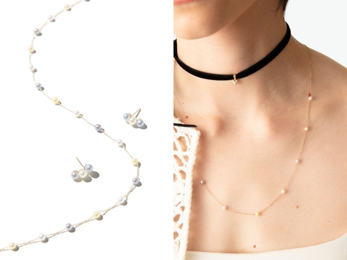 ホワイト、ゴールド、グレー、それぞれ異なる個性をもつカラーパールが出会い、キャンディのように軽やかで甘く洗練された輝きを生み出します。そのほかにも、日常にそっと寄り添いながら一瞬で心にときめきをもたらすジュエリーをラインナップ。