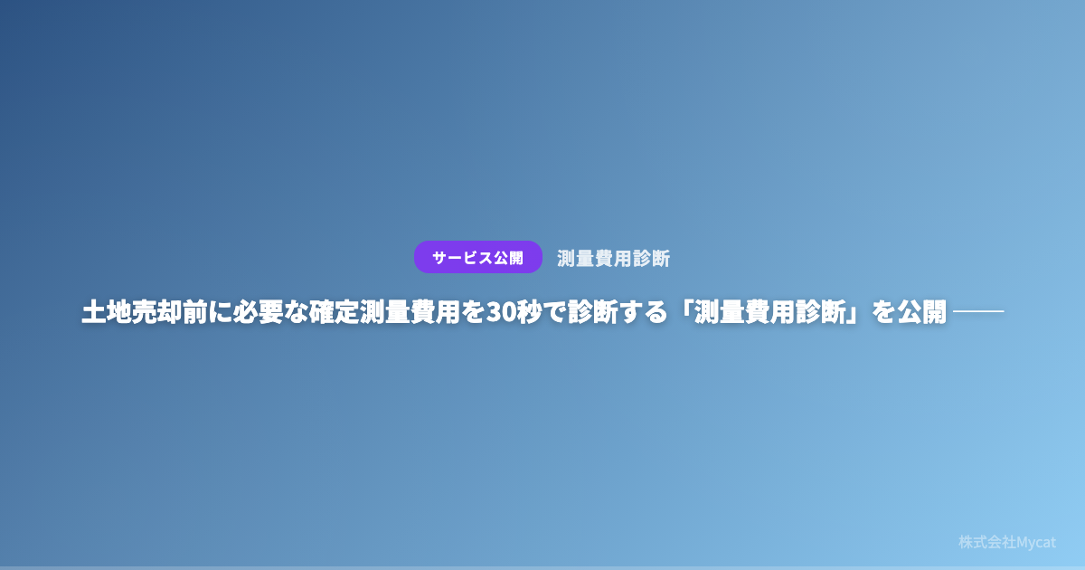 株式会社Mycat(本社:東京都目黒区)は、土地の確定測量費用をオンラインで即算出できるサービス「測量費用診断」(https://sokuryo.xyz)を公開し、累計1,200件超の診断実績をもとに費用算出ロジックの強化を実施したことをお知らせいたします。