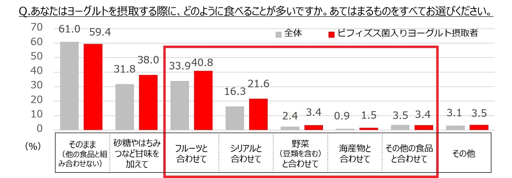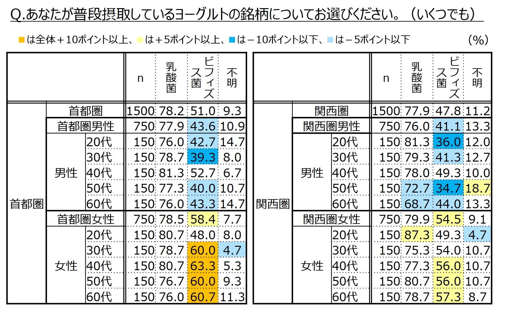 - 1)「ビフィズス菌入りヨーグルト」を摂取している人は49.4%。首都圏女性30~60代では6割超