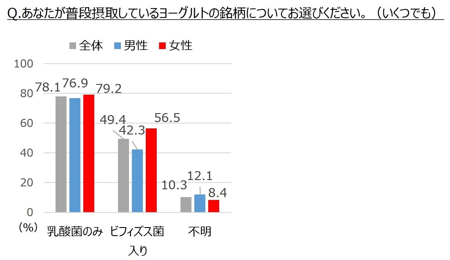 普段食べているヨーグルトを聞いたところ、 「ビフィズス菌入りヨーグルト」は49.4%、「乳酸菌のみ」は78.1%でした。「ビフィズス菌入り」喫食者は、男性42.3%、女性56.5%と女性が多く、特に首都圏女性30~60代は6割を超えました。