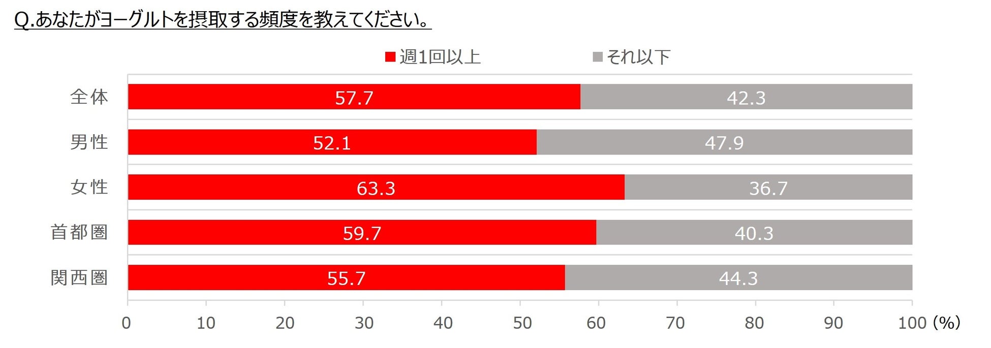 ヨーグルトを日常的に食べている人(週1回以上)は57.7%。喫食頻度は、男女ともに「東高西低」