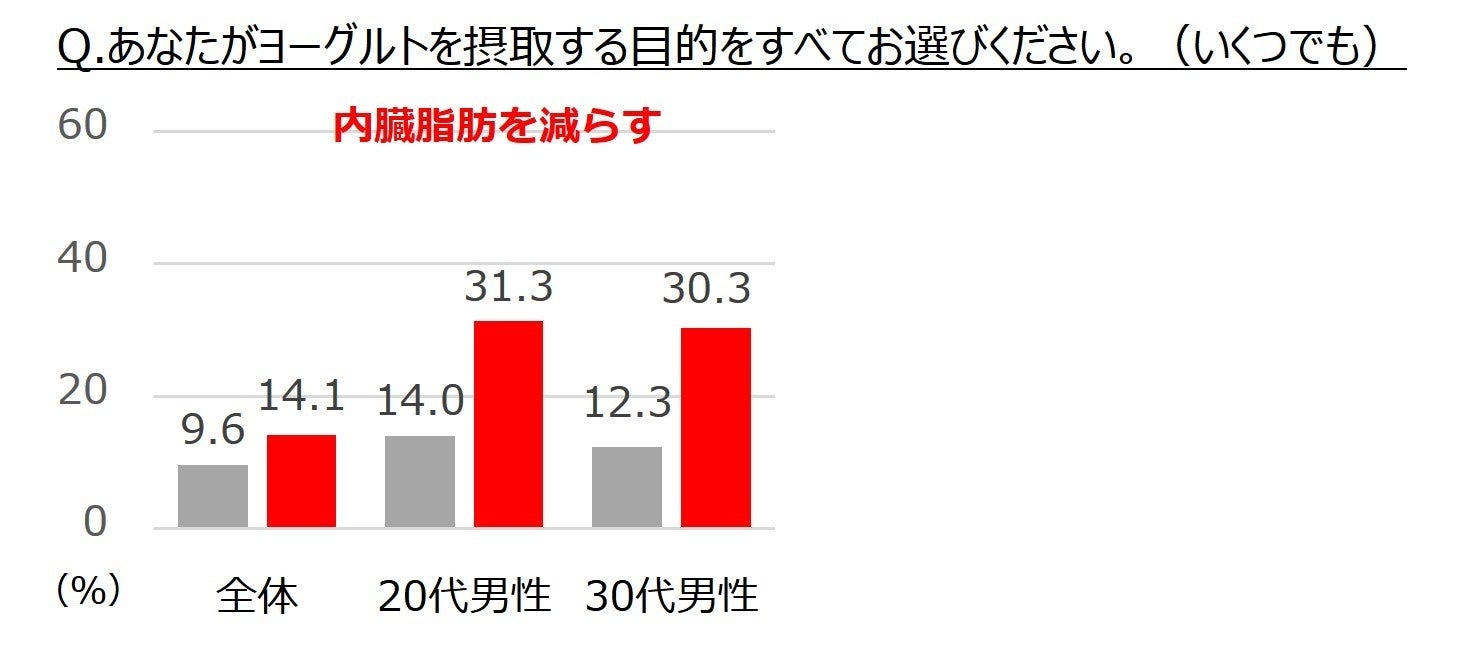 調査の結果、日常的(週1回以上)にヨーグルトを食べている人の5人に1人(女性では4人に1人)が、ビフィズス菌入りのヨーグルトと水溶性食物繊維を合わせて「タンサ脂肪酸」を生み出す活動「タンサ活※」をしていました。一方、実践者の約7割はタンサ脂肪酸の有用性を知らないものの、「タンサ活」を実践していることが分かりました。また「タンサ活」実践者の20代・30代男性は、摂取目的に「ダイエット」「内臓脂肪を減らす」「代謝をよくする」を挙げた割合が高く、健康になることを期待して、ヨーグルトを習慣的に喫食している様子がうかがえました。