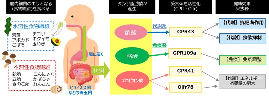 「タンサ(短鎖)脂肪酸」とは、ビフィズス菌などの腸内細菌が、水溶性食物繊維やオリゴ糖などをエサにして作る腸内細菌代謝物です。近年の研究で、体脂肪の低減と基礎代謝の向上など抗肥満作用をはじめ、免疫やストレス反応にも関与することが明らかになっています。