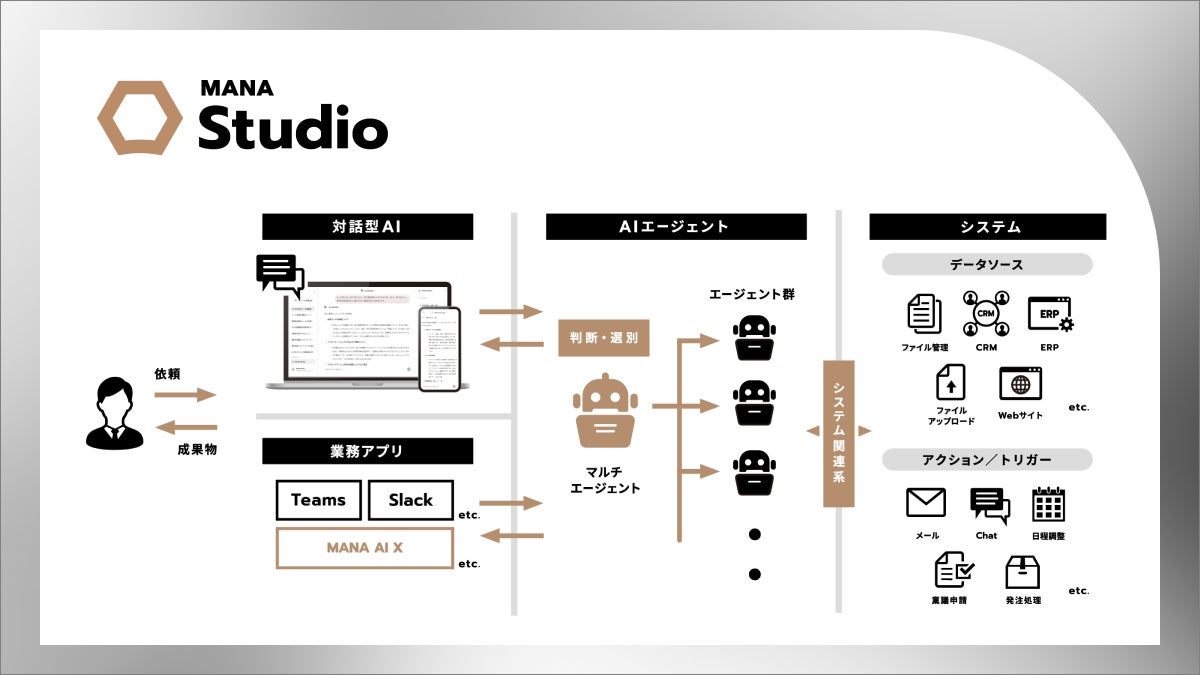 「MANA Studio」は、「With AI」時代の生成AI活用プラットフォームとして、複数のAIエージェントが連携しあう独自のシステムアーキテクチャを構築しており、業務アプリケーションやデータベースと連携可能な高い拡張性も備えています。