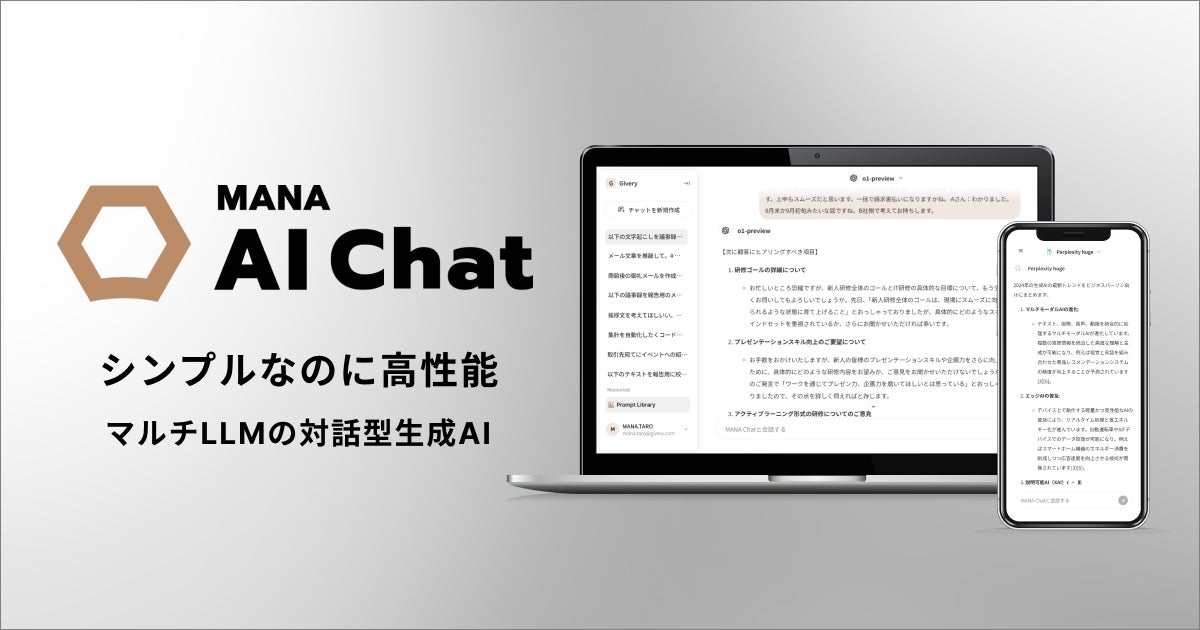「MANA Studio」の機能群のリリース第一弾として、マルチLLMに対応した対話型生成AI「MANA AI Chat」(マナ エーアイ チャット)の提供を開始します。