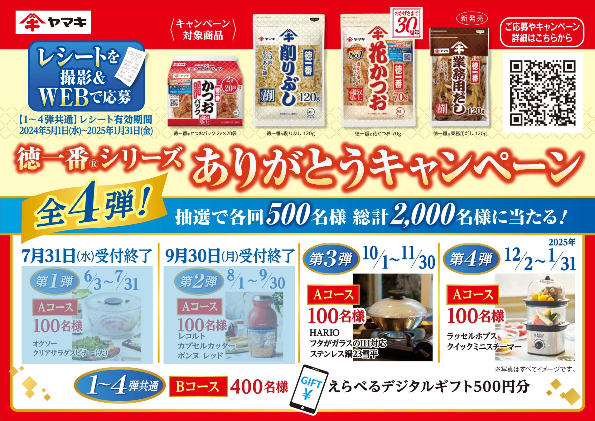 ヤマキ株式会社(本社:愛媛県伊予市 代表取締役社長:城戸善浩、以下ヤマキ)は、削り節カテゴリーにおいて13年連続で購入金額No.1※である「徳一番®花かつお」の発売30周年を記念して、2024年6月から「徳一番®シリーズありがとうキャンペーン」を第1弾から第4弾に分けて実施しています。