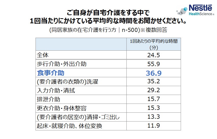 - 介護にかける時間は「食事介助(平均36.9分)」が、「歩行介助(平均55.9分)」に続き2位に。