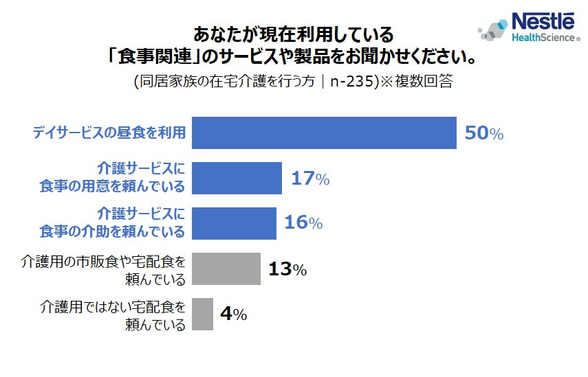 - 在宅介護者の約6割は食事に関する「外部サービスなどを利用」。