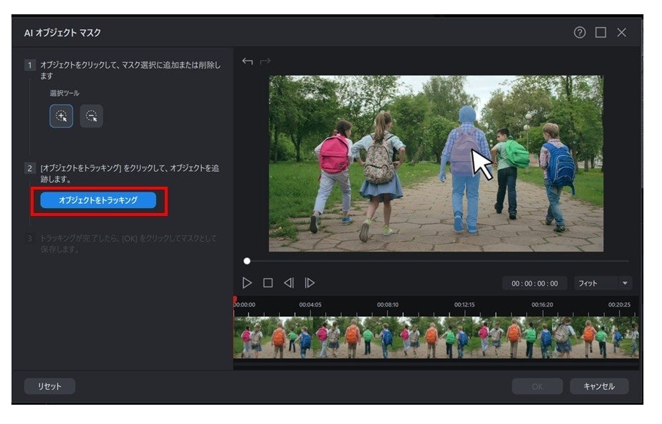 マスクを適用したいオブジェクトをクリックして選択し「オブジェクトをトラッキング」をクリックすると、ビデオクリップ内のそのオブジェクトだけにマスクを適用することができます。