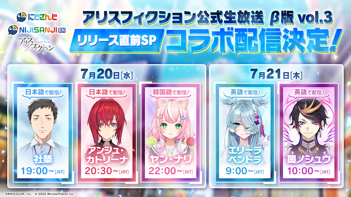 『アリスフィクション』公式の配信チャンネルでご覧になるのも、お好きな配信者さんと一緒に盛り上がるのも、皆さまのお好みで『アリスフィクション』公式生放送 β版 vol.3 リリース直前SP当日をお楽しみください。