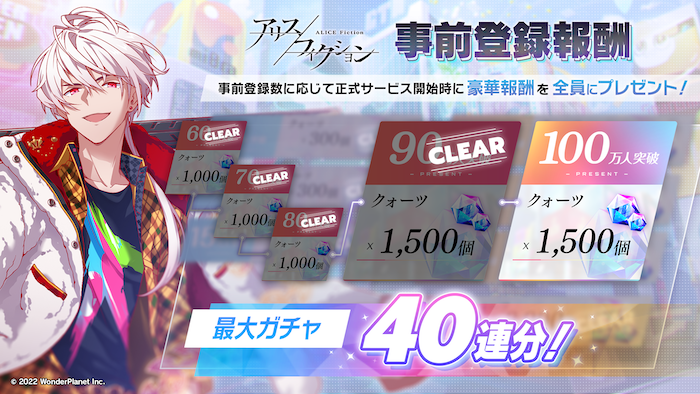 エンターテインメントサービス事業を行うワンダープラネット株式会社(本社:愛知県名古屋市、代表取締役社長CEO:常川友樹、東証グロース:証券コード4199、以下当社)は、今夏全世界同時配信リリース予定の新作スマートフォン向けゲーム『アリスフィクション』の事前登録者数が、全世界で90万人を突破したことをお知らせいたします。