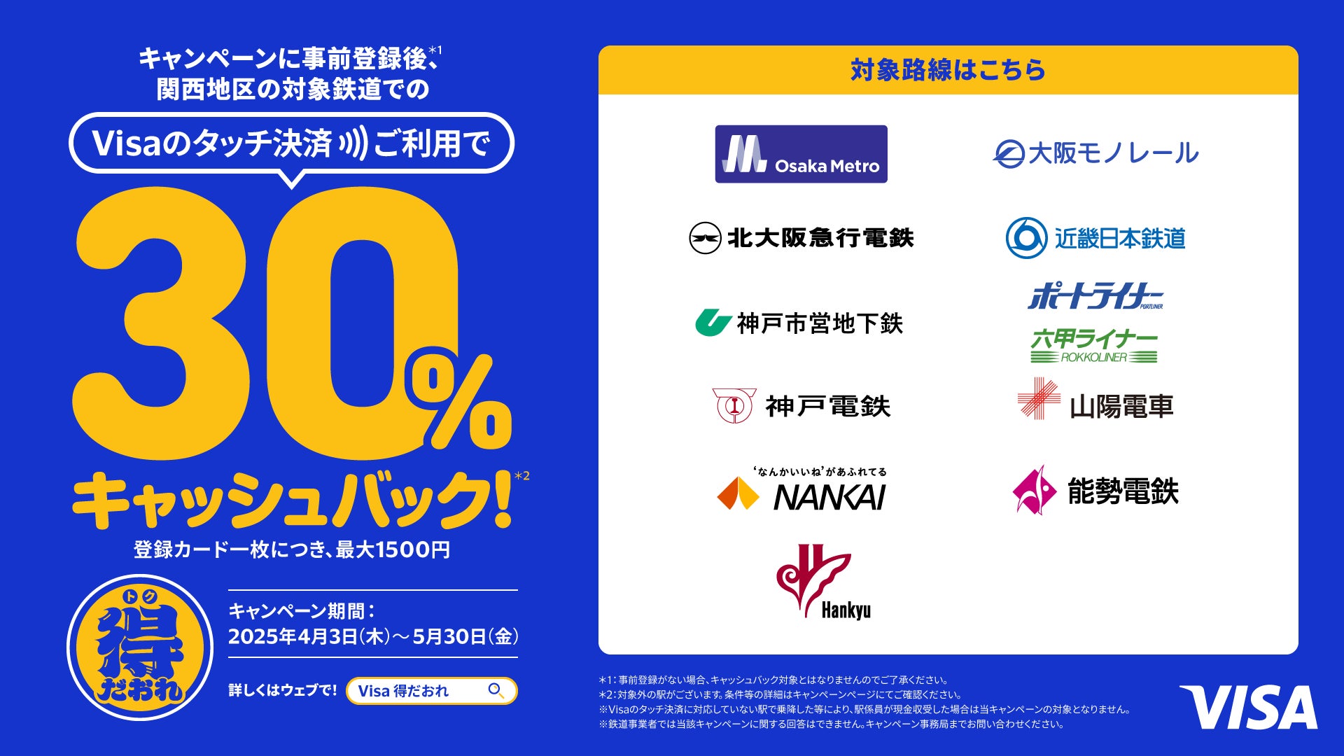 ビザ・ワールドワイド・ジャパン株式会社(本社:東京都千代田区、代表取締役社長:シータン・キトニー)は、明日2025年4月3日(木)より2025年5月30日(金)まで(以下 キャンペーン期間)、「タッチ決済で鉄道もお得!30%キャッシュバックキャンペーン」(以下 本キャンペーン)を以下の対象鉄道事業者にて実施することを発表いたします。