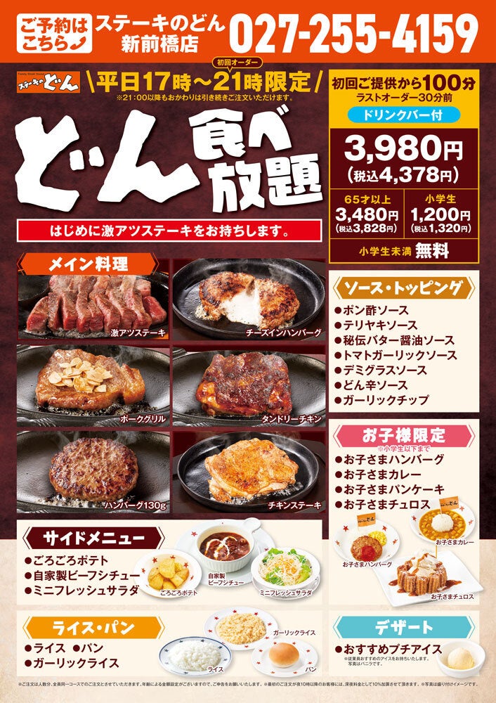 ●「ステーキのどん新前橋店」にお電話で「食べ放題予約」とお伝えください。